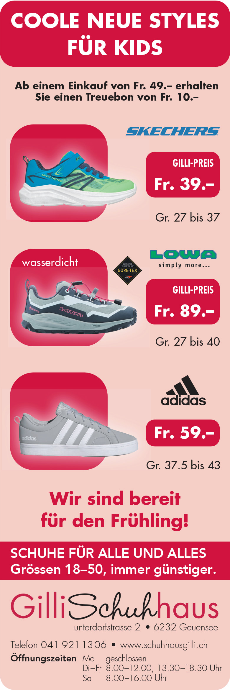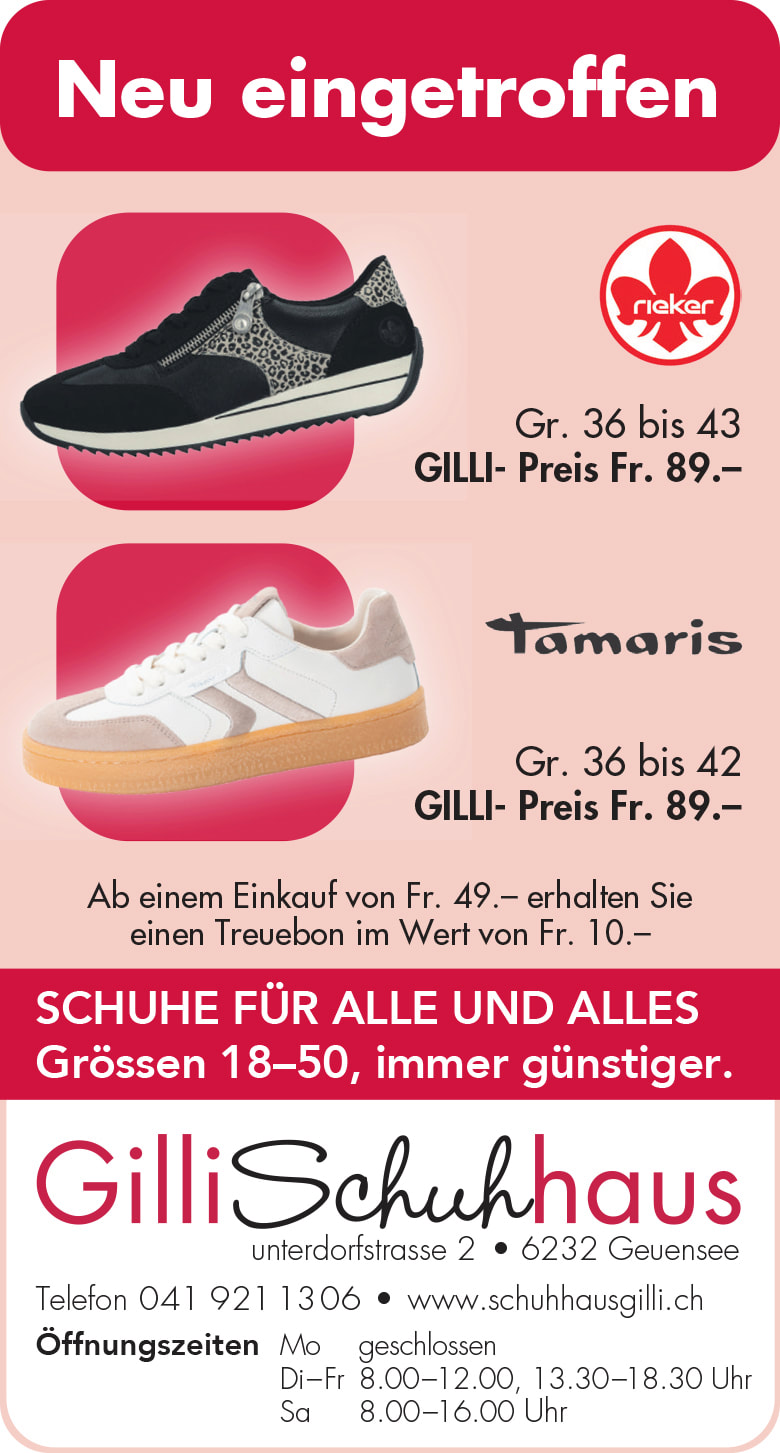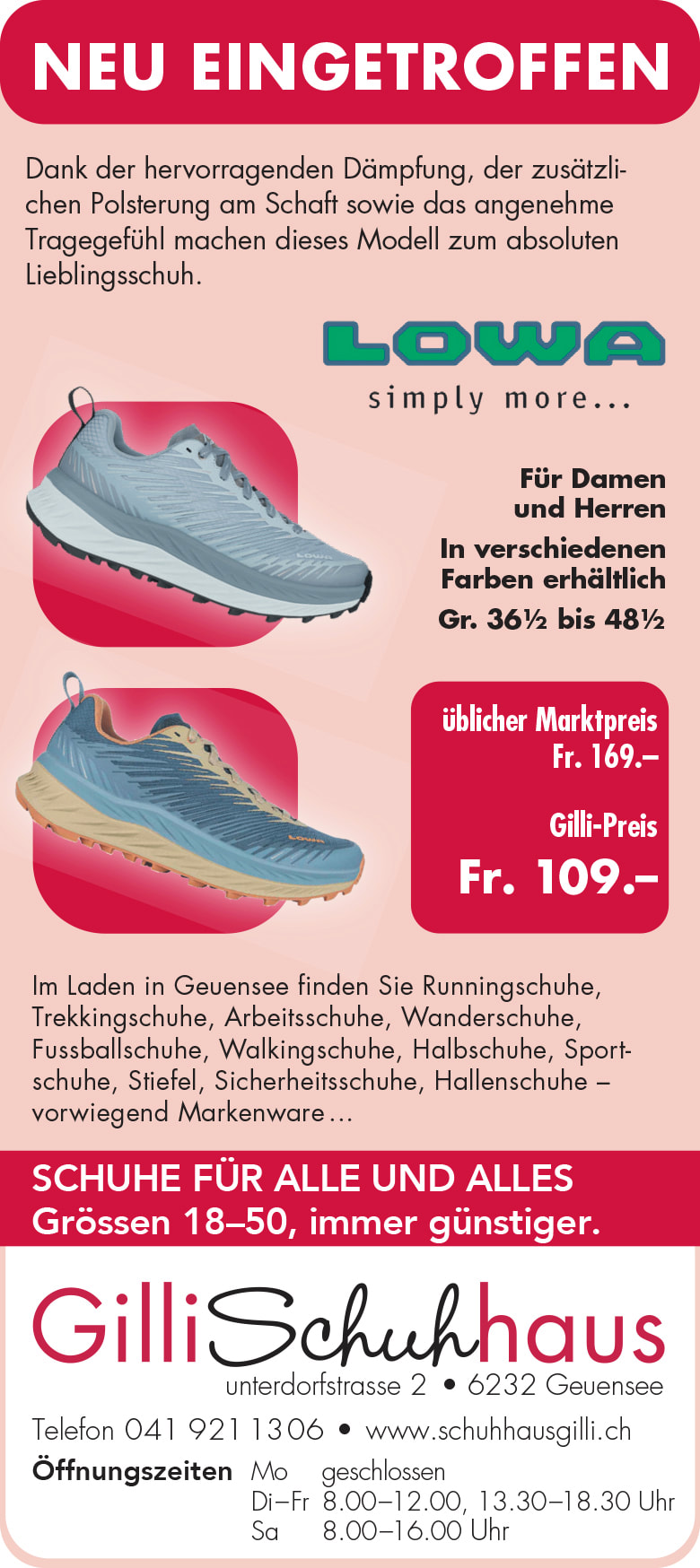 Lowa, Meindl, adidas, Tamaris, Rieker, Superfit, Legero, Skechers usw. sind nur einige von vielen klingenden Namen aus der Schuhbranche die man in Geuensee findet. «Das grosse Lager bietet uns die Möglichkeit, grosse Mengen zu günstigen Konditionen einzukaufen». Oft sind es Restposten von Qualitäts-Markenschuhen.